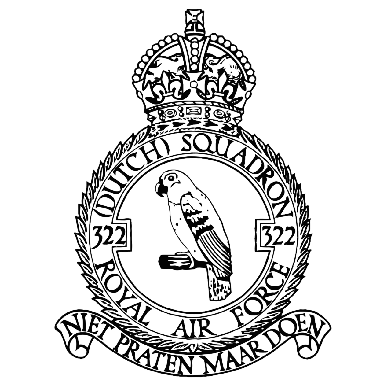 Over de embleemspreuk bleef vooralsnog echter een meningsverschil bestaan tussen de vliegers van het 322 Squadron en de autoriteiten in Londen. In Woodvale, waar de Nederlandse Spitfire-eenheid tot eind 1943 was gestationeerd, opteerde men voor de woorden “niet praten, maar schieten”. In opdracht van het Ministerie van Oorlog moest dit uiteindelijk worden gewijzigd in “niet praten, maar doen”. Na beoordeling door het College of Arms werden het embleem en de embleemspreuk op 4 maart 1945 door Koning George VI definitief goedgekeurd.